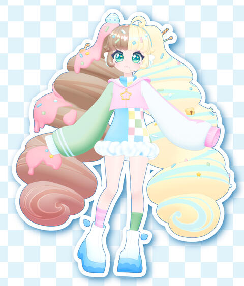 Icebell is the character that represents me! She has gone through many iterations, and may undergo more. This version was made between 2023-2024. Planning started early in 2023, and the model got revealed in 2024, so this was a project I kept on the backburner for a while.The design is inspired by ice cream, clouds, cafe, flying, swirls and stars.